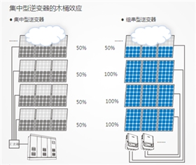 第一,避免了集中型逆變器電站的木桶效應(如下圖)。集中式并網(wǎng)逆變系統(tǒng)中,組件方陣經(jīng)過兩次匯流到達逆變器,逆變器最大功率跟蹤功能(MPPT)不能監(jiān)控到每一路組件的運行情況,因此不可能使每一路組件都處于最佳工作點,當有一塊組件發(fā)生故障或者被陰影遮擋,會影響整個系統(tǒng)的發(fā)電效率。所以當電池組件受到遮擋時,集中型電站會受到較大的影響,組串型電站只有被遮擋的一串對應的一路MPPT受到影響。而正常情況下,各個組件之間的安裝間距,安裝角度各異,一天中一定時間內(nèi)不可避免會產(chǎn)生局部遮擋,特別是早晚時刻太陽高度角較低的時候,或者出現(xiàn)一些植被遮擋一些電池片。若一個500KW方陣的電池板使用一路MPPT來跟蹤,會損失一定的發(fā)電量。該情況同樣適用于當電池組件發(fā)生臟污、陰影、老化、升溫、熱斑的情況下。